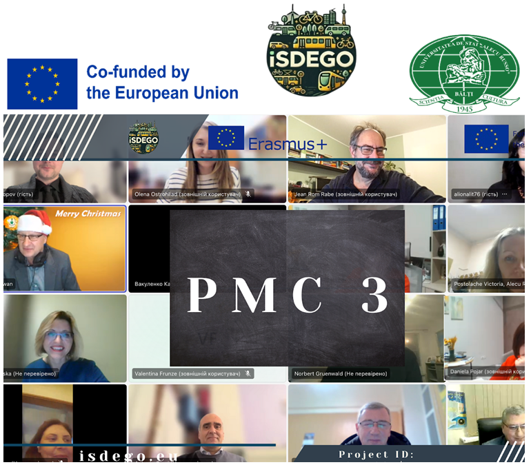 La 19 decembrie 2025, a avut loc, în format online, cea de-a 3-a reuniune a Comitetului de Management al Proiectului (PMC) din cadrul proiectului Erasmus+ CBHE ISDEGO – Implementarea Obiectivelor de Dezvoltare Urbană Durabilă în programele de licență în domeniul transporturilor.