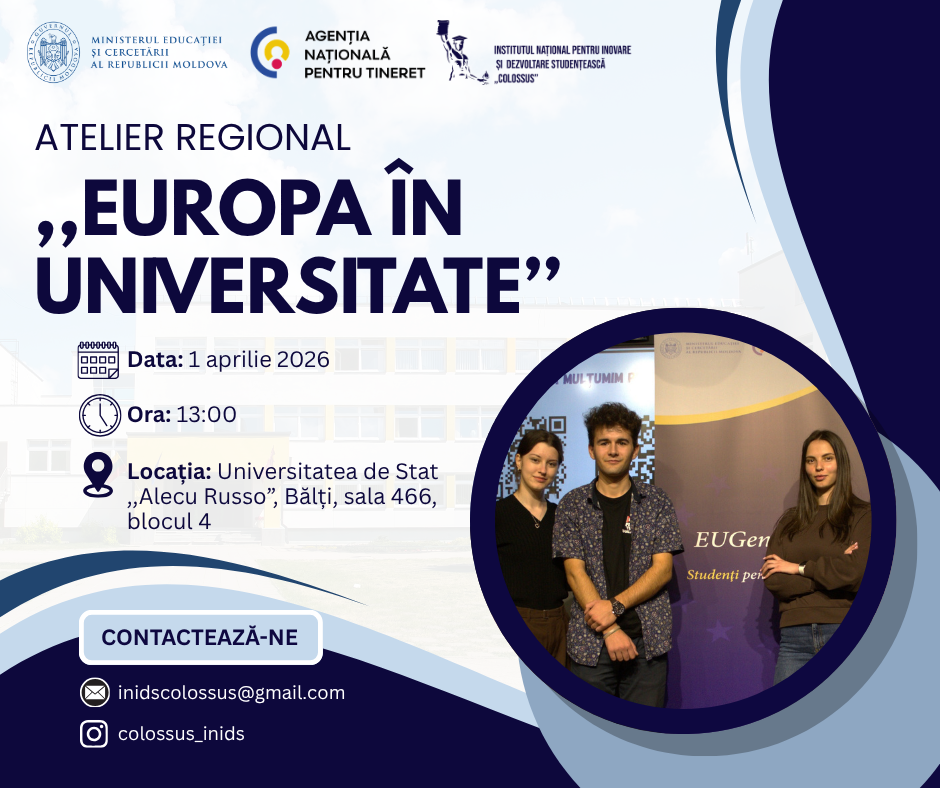 Proiectul “EUGeneration: Studenți pentru Democrație” este implementat de Institutul Național pentru Inovare și Dezvoltare Studențească “Colossus”, cu sprijinul Agenției Naționale pentru Tineret, în cadrul Programului anual de Granturi pentru Organizațiile de Tineret 2026 susținut de Ministerul Educației și Cercetării al Republicii Moldova.