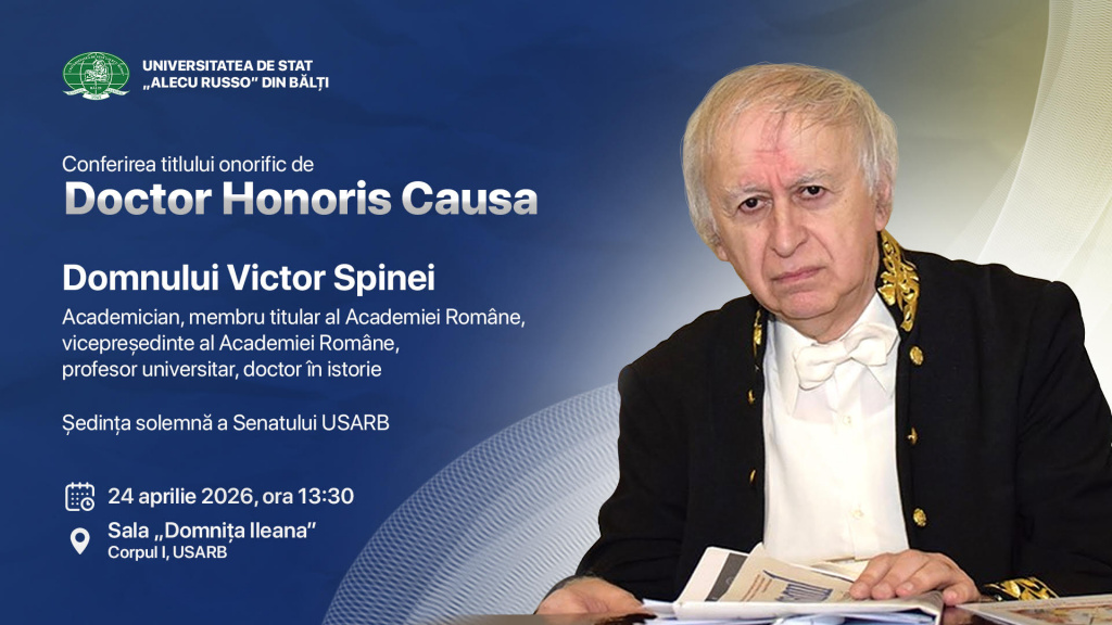 Comunitatea academică a Universității de Stat „Alecu Russo” din Bălți este invitată să onoreze excelența și valorile instituției prin participarea la Ședința solemnă a Senatului USARB, dedicată conferirii titlului onorific de Doctor Honoris Causa domnului Victor Spinei, academician, membru titular și vicepreședinte al Academiei Române, profesor universitar, doctor în istorie.