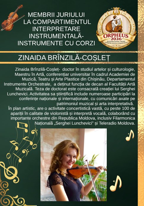 Din juriu face parte și Zinaida Brînzilă-Coșleț, doctor în studiul artelor și culturologie, Maestru în Artă și conferențiar universitar la Academia de Muzică, Teatru și Arte Plastice. Activitatea sa științifică și artistică este remarcabilă, incluzând cercetări dedicate patrimoniului muzical, precum și o bogată carieră concertistică, cu numeroase apariții alături de orchestre importante, inclusiv Filarmonica Națională și Teleradio Moldova.