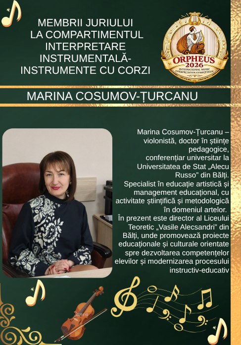 De asemenea, o prezență valoroasă în juriu este Marina Cosumov-Țurcanu, violonistă, conferențiar universitar și doctor în științe pedagogice la Universitatea de Stat „Alecu Russo” din Bălți. Specialist în educație artistică și management educațional, aceasta îmbină activitatea didactică și științifică cu cea managerială, fiind în prezent director al Liceul Teoretic „Vasile Alecsandri” din Bălți.