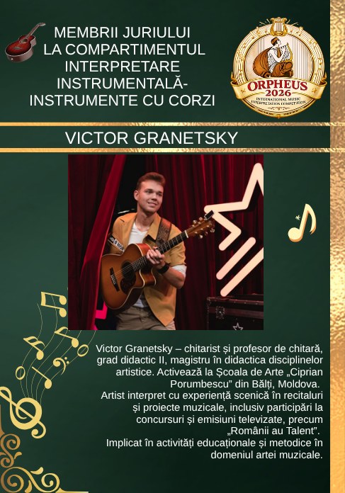 Componența juriului este completată de Victor Granetsky, chitarist și profesor cu grad didactic II, magistru în didactica disciplinelor artistice, activând la Școala de Arte „Ciprian Porumbescu”. Artist interpret cu experiență scenică solidă, a participat la numeroase recitaluri, concursuri și proiecte muzicale, inclusiv la emisiunea Românii au Talent, contribuind activ la formarea noii generații de muzicieni.