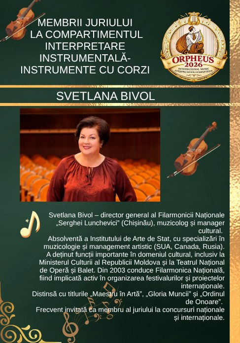În fruntea juriului se află Svetlana Bivol, director general al Filarmonica Națională „Serghei Lunchevici” (Chișinău), muzicolog și manager cultural de prestigiu. Absolventă a Institutului de Arte de Stat, cu formări internaționale în muzicologie și management artistic în SUA, Canada și Rusia, a ocupat funcții importante în cadrul Ministerului Culturii al Republicii Moldova și al Teatrul Național de Operă și Balet. Din anul 2003 conduce Filarmonica Națională, fiind o figură-cheie în promovarea proiectelor culturale de anvergură. Activitatea sa a fost apreciată prin distincții precum „Maestru în Artă”, „Gloria Muncii” și „Ordinul de Onoare”.